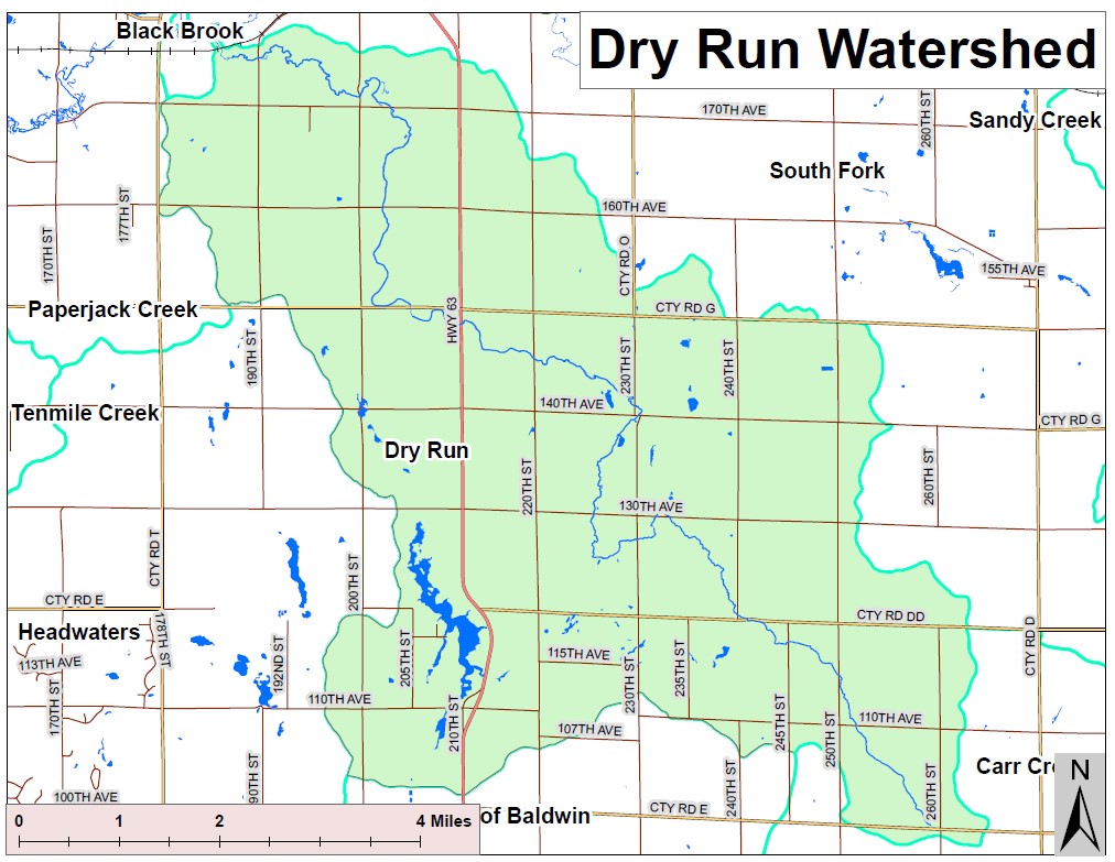 The Dry Run watershed encompasses the area outlined in green.