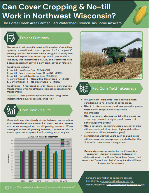 See Dane Christenson’s presentation slides on the test plot, here. In the fall of 2021, Dennis Busch of UW Platteville did an infiltration study on the plots. See his presentation on findings from Horse Creek and around the midwest here.